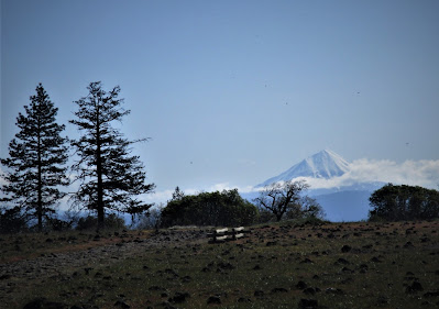 The Rogue River, like a great green snake, curves across orchards, ranches and gravel pit ponds toward the distant white cone of Mt. McLoughlin. Turkey vultures soar on updrafts.